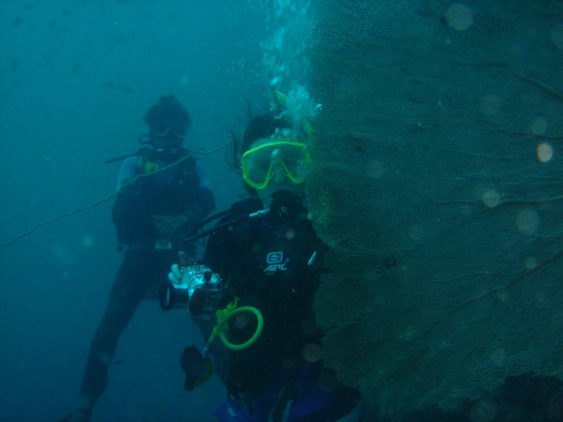 Charlotte behind large coral fan